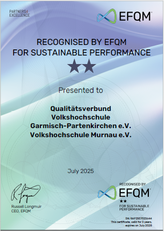 In einem gemeinsamen Assessment mit der Volkshochschule Murnau e.V. hat sie im Juli 2025 den Status " Recognised by EFQM 2 Star 2025" (European Foundation für Quality Management) erreicht.